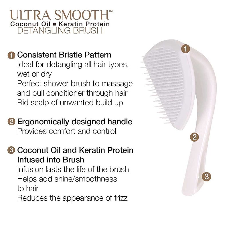 - COCONUT AND KERATIN PROTEIN INFUSED – A blend of Coconut oil and Keratin protein infused plastic that replaces tangles with luxurious shine and a smooth, silky feel. It also gives this hair brush anti-frizz properties.