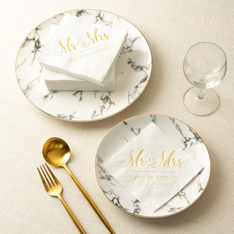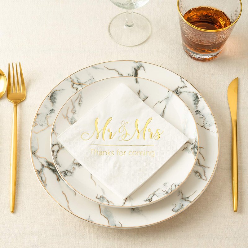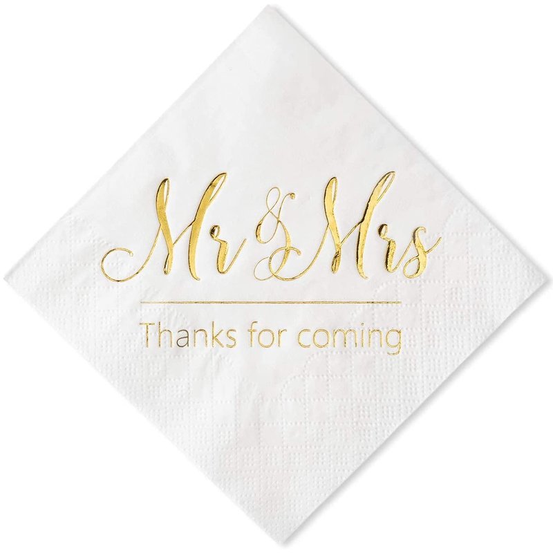 Crisky Napkins Mr and Mrs Gold Cocktail Beverage Dessert for Wedding Shower Engagement Party Decorations, Cake Table Decor Supplies. 100 Pcs, 3-Ply