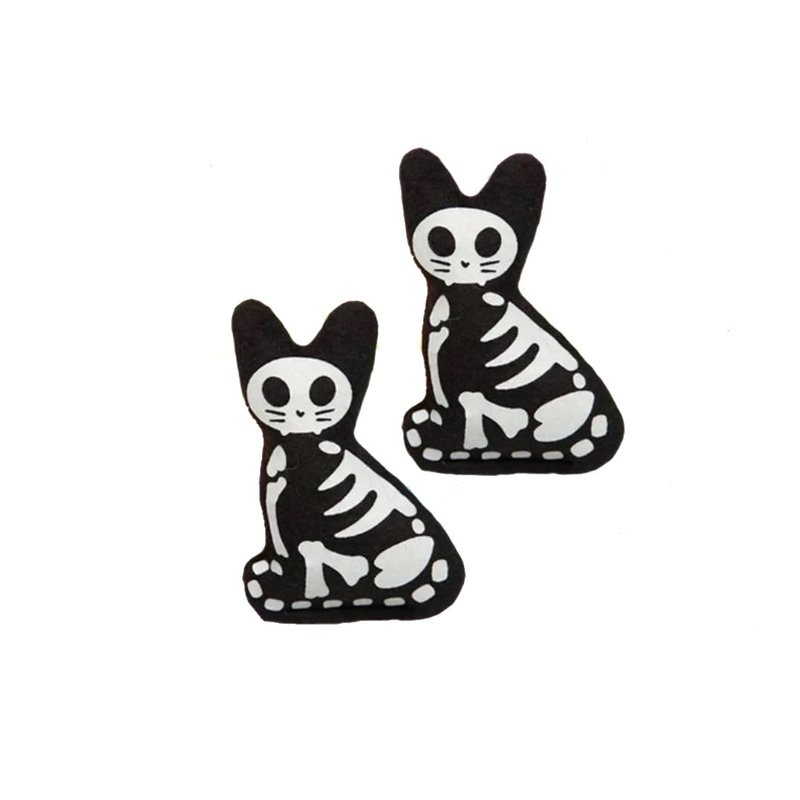 "Skelekitty" designer cat toy twin pack. This fun set is made of a soft felt plush & filled with organic catnip... sure to be your kitty's Halloween favorite. AND, they glow-in-the-dark! Handmade with premium, durable & safe materials in the USA. Each measure approximately 4".