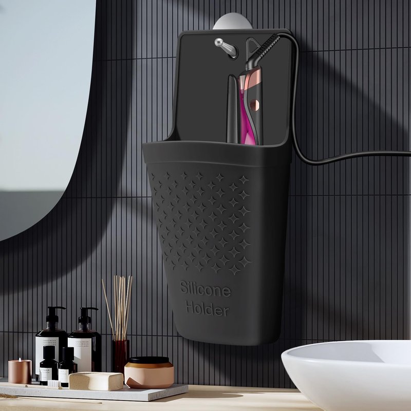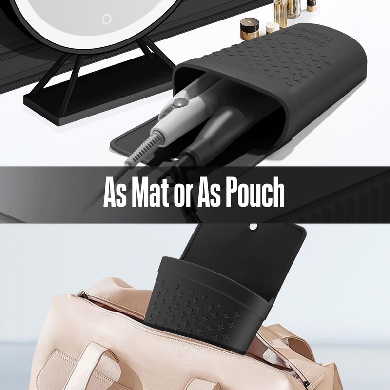 - THREE FUNCTIONS:As a mat, to protect any surfaces from heat damage. As a pouch, to store the hair iron tool even while it is hot. As a holder, to hang on any smooth surface like wall or dressing table with an stainless steel adhesive hook (comes with the product)