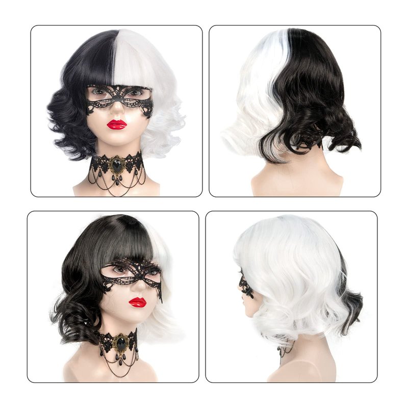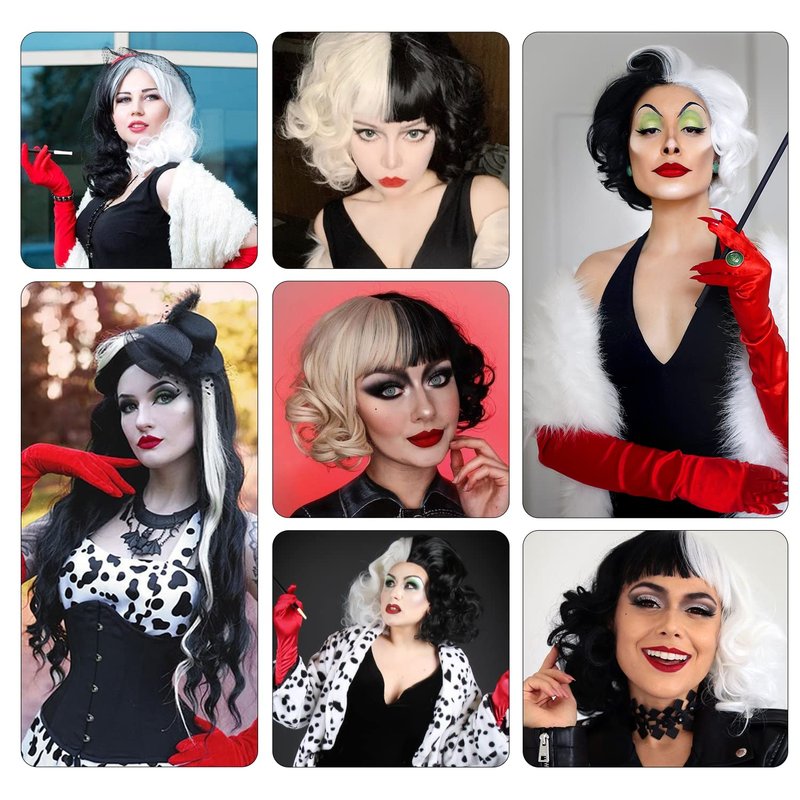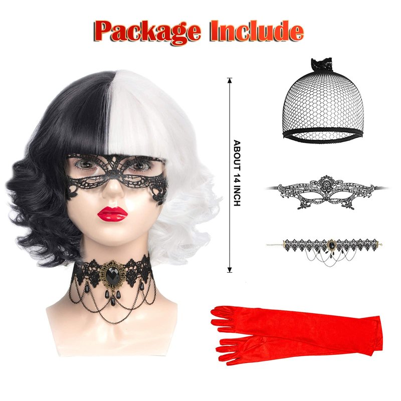 - 【Package List】1Pcs Cruella deville wig, 1pcs resilient mesh wig cap, 1 pair of red gloves, 1pcs lace mask and 1pcs lace beads necklace. Fine Cruella wig and decorations are enough for you to role-play beautifully.