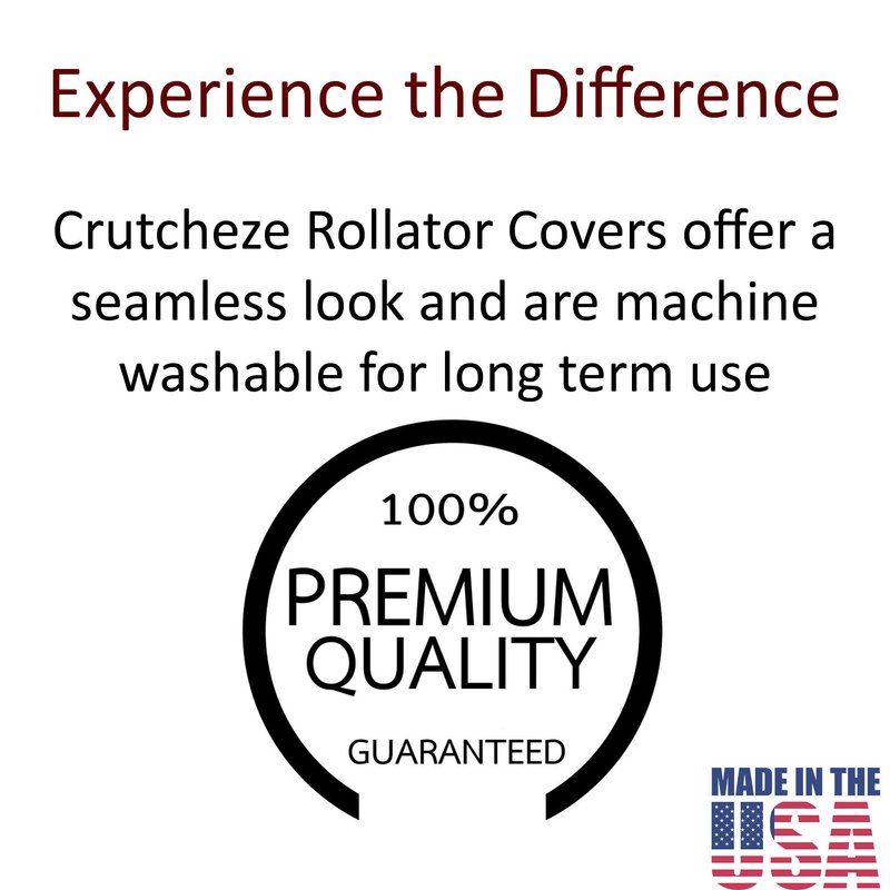 Rollator seat and backrest cover Made in USA. Designed by healthcare professionals to be exceptionally comfortable, fashionable and affordable. Rollator covers are one of the most popular walker accessories. Crutcheze rollator cover set contains a seat cover and separate rollbar cover. Odor control, moisture wicking, breathable, quick drying covers keep skin dry and comfortable plus UV-Ray protection. Easy installation, stretch cover over rollator seat and tighten with sewn in elastic band. Washable, Latex free, One size fits most standard rollator walkers (Does not fit bariatric sizes). Rollator and bag NOT included 100% Satisfaction Guarantee. High quality fabric is lightweight, washable and removable. Our rollator covers are sold in hospitals and medical clinics across the country.