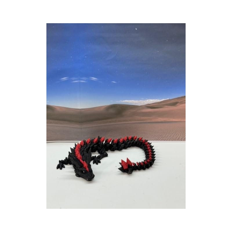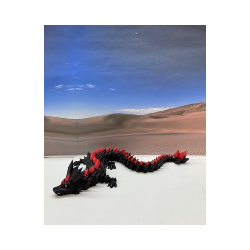 3D Printed enchanting Articulated Black and Red Crystal Dragon - a mystical creature that brings a touch of fantasy to your world. Unveil the mystery of this Black and Red Crystal Dragon ( measures 12" long) a captivating fusion of elegance and fantasy. this dragon reveals itself with a symphony of colors - a testament to its magical heritage. ------- Small Components Advisory: ------- Please note that this product may contain small components and might not be suitable for very young children. Given the characteristics of 3D printing, there is a potential for small components to detach if handled aggressively or dropped. Therefore, we advise against allowing younger children to interact with the dragon. Please consider that 3D printed objects might include minor imperfections such as layer lines. These are a natural and inherent aspect of the printing process. We strive to produce the highest quality items, and these imperfections contribute to the unique character of each piece. Recall the unique creation of each dragon, crafted exclusively for you. The color selections available are depicted in the provided photos. Please be aware that variations in color may occur due to discrepancies in filament production and the characteristics of the monitor or screen you are utilizing to view the listing. Additionally, the arrangement of prints using multi-colored filament rolls can influence color distribution. ------- Licensing Information: ------- Authorized Design: NOHo3D holds the official authorization for the production of this exquisite design created by CinderWing3D.