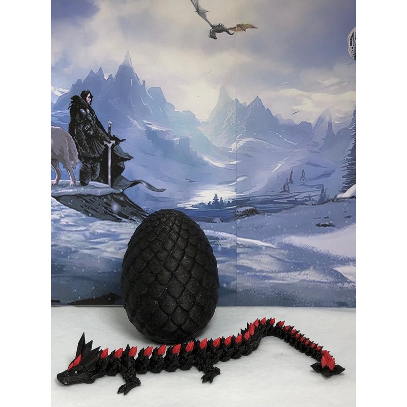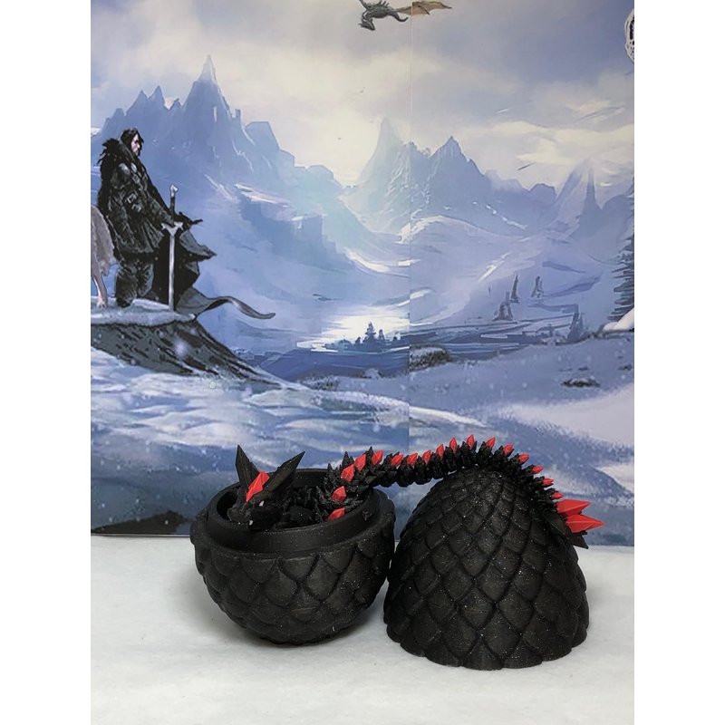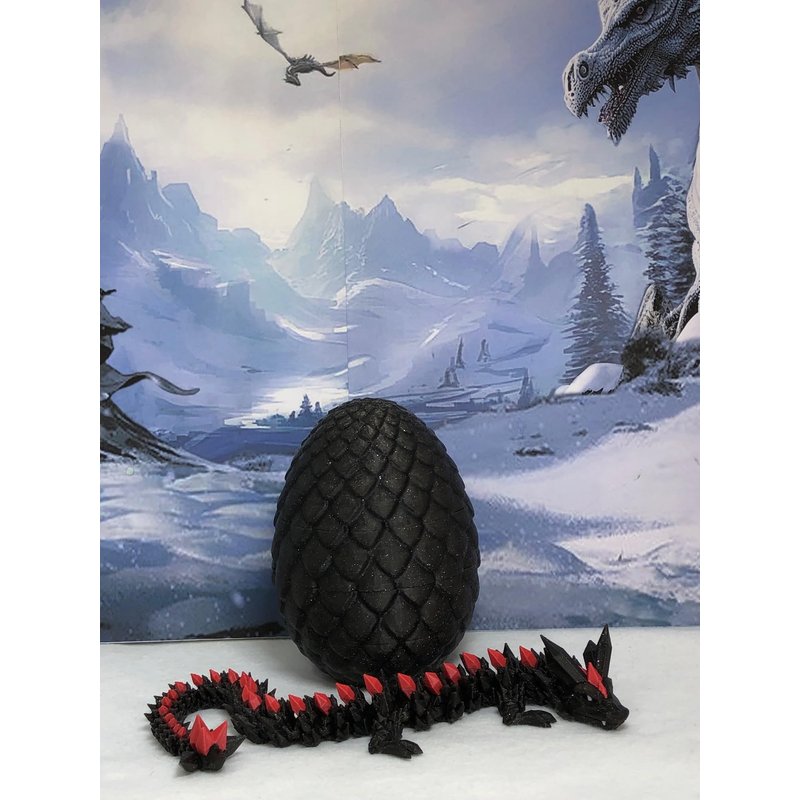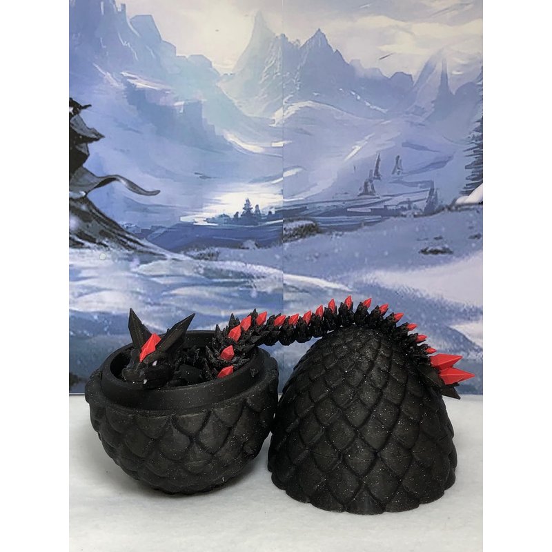 3D Printed enchanting Articulated Black and Red Crystal Dragon - a mystical creature that brings a touch of fantasy to your world. Unveil the mystery of the Galaxy Dragon Egg and this Black and Red Crystal Dragon ( measures 12" long) a captivating fusion of elegance and fantasy. Encased within a meticulously designed crystal egg, this tiny dragon reveals itself with a symphony of colors - a testament to its magical heritage. ------- Small Components Advisory: ------- Please note that this product may contain small components and might not be suitable for very young children. Given the characteristics of 3D printing, there is a potential for small components to detach if handled aggressively or dropped. Therefore, we advise against allowing younger children to interact with the dragon. Please consider that 3D printed objects might include minor imperfections such as layer lines. These are a natural and inherent aspect of the printing process. We strive to produce the highest quality items, and these imperfections contribute to the unique character of each piece. Recall the unique creation of each dragon, crafted exclusively for you. The color selections available are depicted in the provided photos. Please be aware that variations in color may occur due to discrepancies in filament production and the characteristics of the monitor or screen you are utilizing to view the listing. Additionally, the arrangement of prints using multi-colored filament rolls can influence color distribution. ------- Licensing Information: ------- Authorized Design: NOHo3D holds the official authorization for the production of this exquisite design created by CinderWing3D.