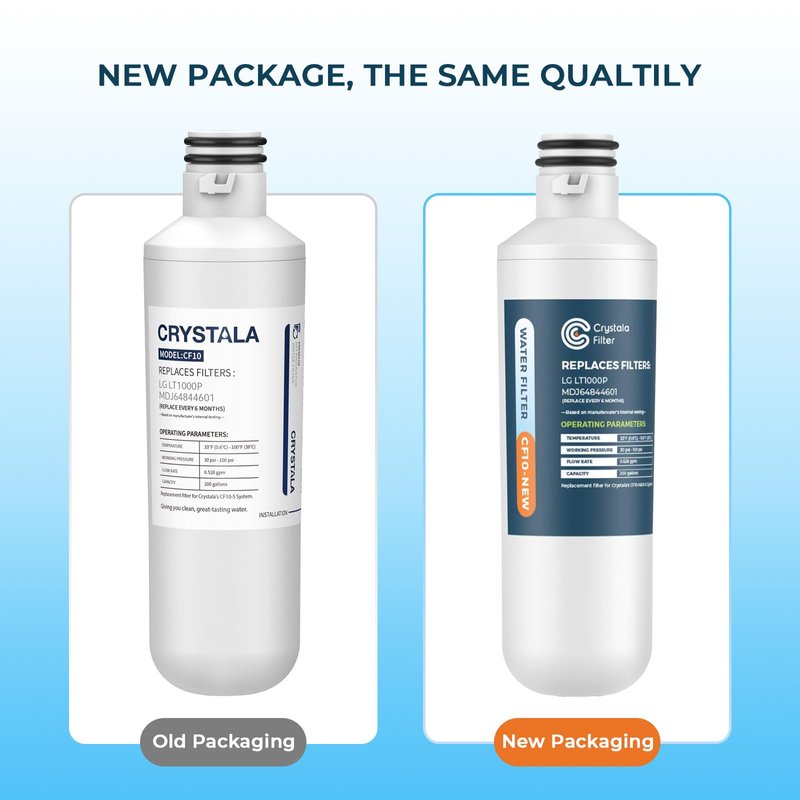 - LT1000P Water Filter Life: Recommended to replace your Crystala water filter every 6 months or 200 gallons. Please replace your water filter sooner if a noticeable reduction in flow rate occurs.