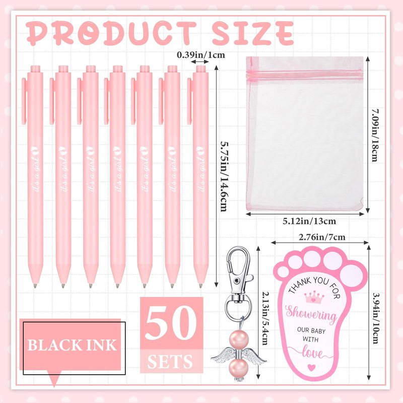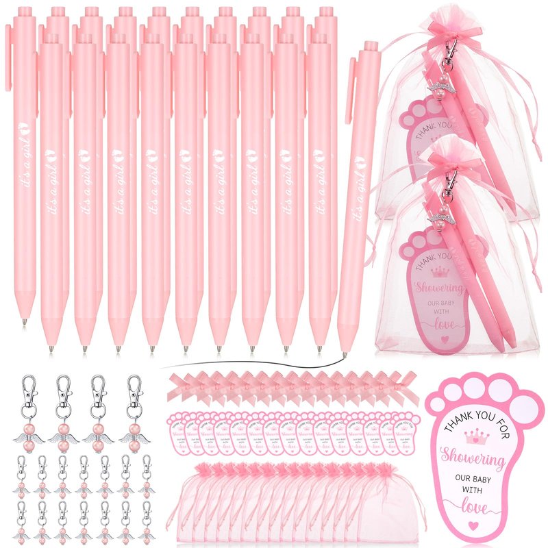 - Rich in Combination: the package comes with 250 pieces of baby shower party favors for girl, including 50 pieces of it's a girl pens, 50 pieces of angle pendant keychains, 50 pieces of pink bows, 50 pieces of organza bags and 50 pieces of thank you cards, adequate in quantity to satisfy your party supplies needs