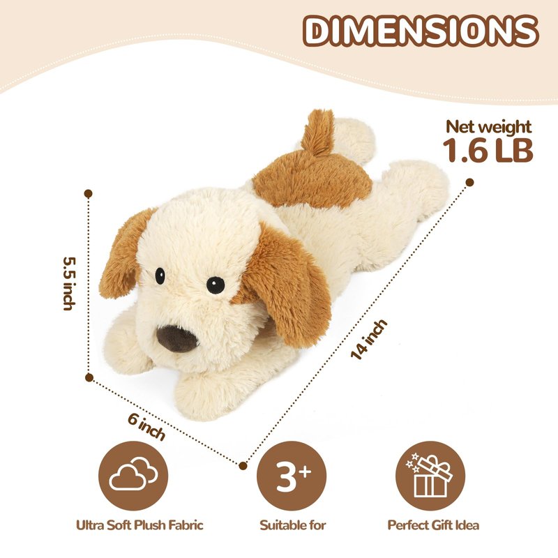- LIFELIKE PUPPY APPEAEANCE: This plush is approx: 14"L x 6"W x 5.5"H in size. Meet your cutest puppy stuffed animal companion, resting in a cozy, lay-down position for added cuteness and comfort. This heating pad stuffed animal is irresistibly soft, featuring shaggy fur, an endearing facial expression. It's the ideal cuddle buddy, bringing warmth and joy to both kids and adults alike. A unique and delightful gift for any dog lover, sure to add charm to any setting