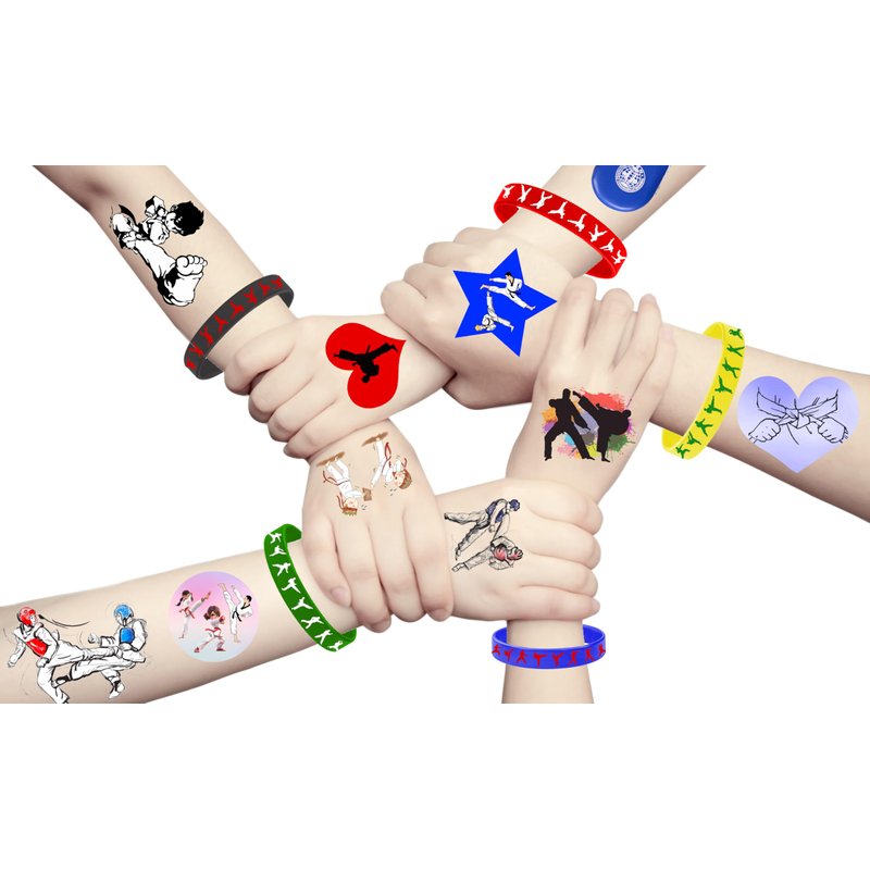 - Package of 176 taekwondo themed temporary tattoos with more than 22 designs.