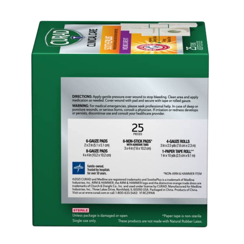 Curad SoothePlus Wound Care Kit with Arm & Hammer Baking Soda, Assorted Pack of Gauzes and Tape, 25 Count
