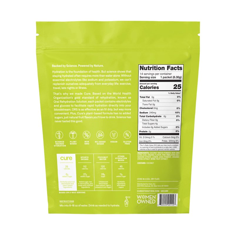 Cure is an electrolyte powder made with real ingredients like coconut water and pink Himalayan salt. Each pack of Cure has 4x the electrolytes of leading sports drinks, but no added sugar or artificial anything. Whether you’re recovering from this morning’s workout or last night’s happy hour, Cure gives you everything you need for optimal daily hydration and nothing more.
