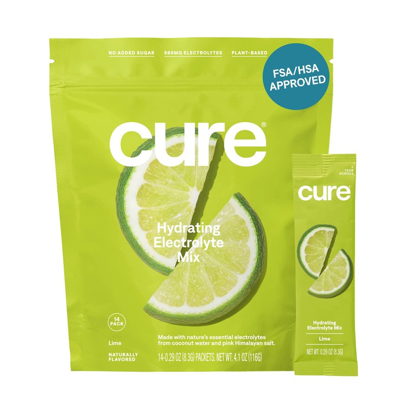 Cure Hydrating Plant Based Electrolyte Mix | Powder for Dehydration Relief | Made with Coconut Water | Non-GMO | No Added Sugar | FSA & HSA | Vegan | Gluten Free | Pouch of 14 Packets - Lime