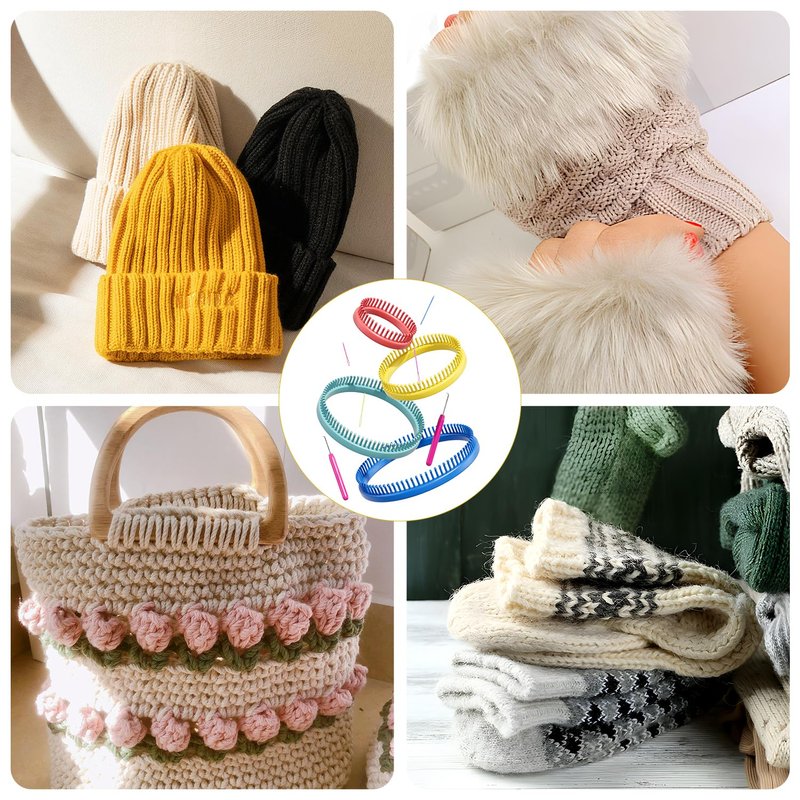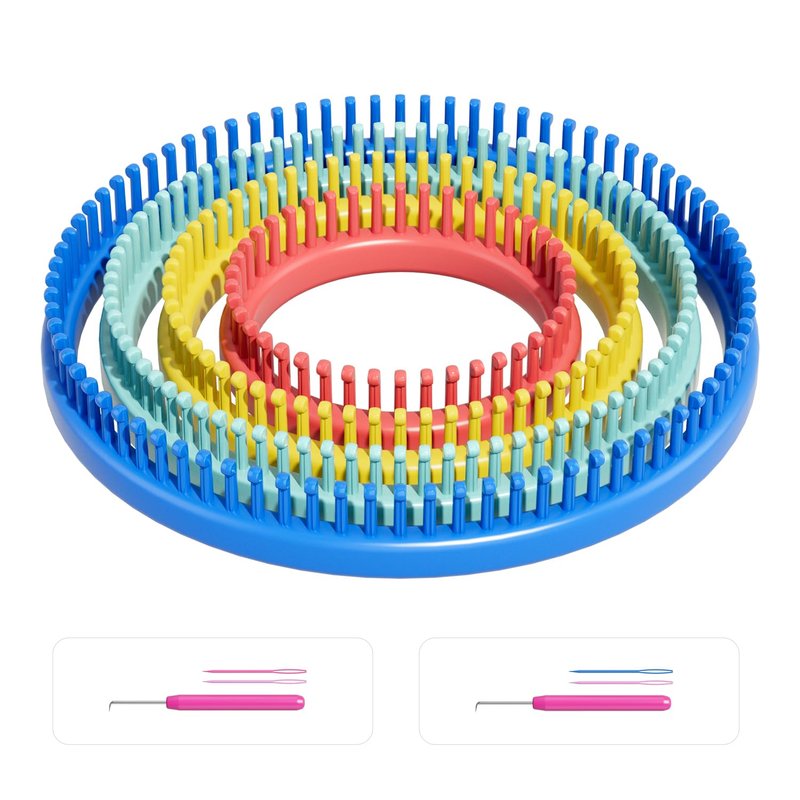 - Including: Round knitting looms Set includes 4 sizes looms ( 5inch loom; 7.1 inch loom; 9 inch loom; 11 inch loom), two Yarn Needle, two Loom Pick, one Basic instructions.