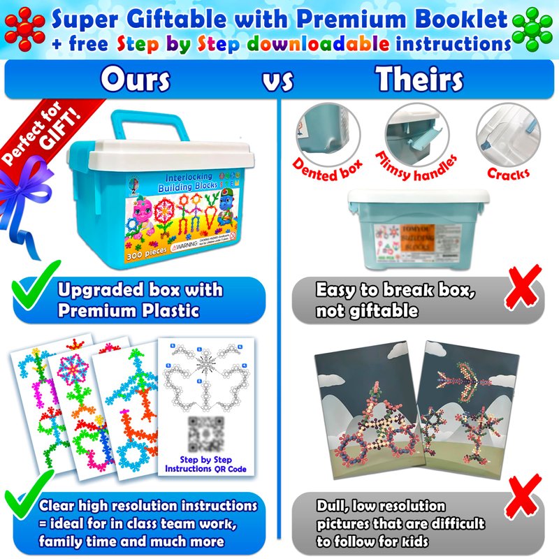- ★ Excellent Value: Includes 300 pieces of colorful building blocks, it can be easy to combine into any shape. Such as flowers, animals, cars, buildings, worlds and more.