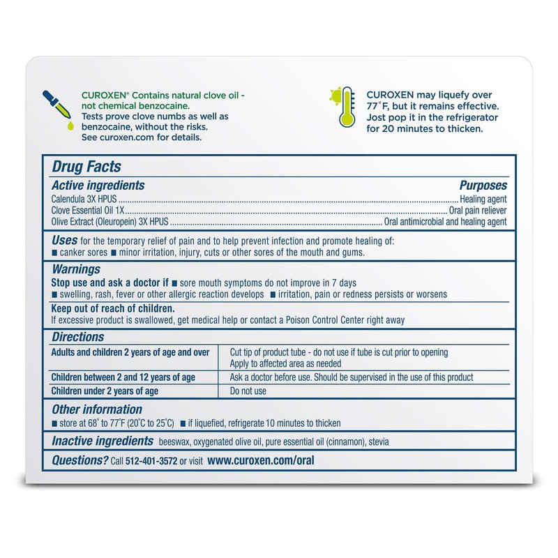 - ADVANCED FORMULA: CUROXEN does NOT contain any artificial chemicals. This mouth care cream is manufactured under strict Good Manufacturing Practices per U.S. Food and Drug Administration (FDA) guidelines.