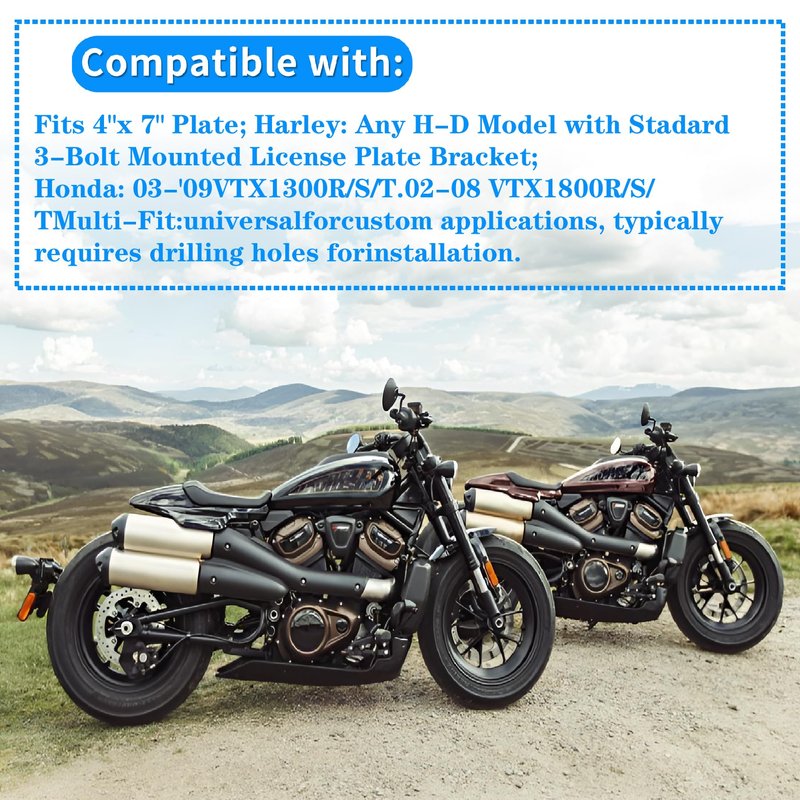 - 【Compatibility】Fit for Harley: Any H-D Model with Standard 3-Bolt Mounted License Plate Bracket & Universal for Custom Applications; Compatible with Honda: '03-'09 VTX1300R/S/T, '02-'08 VTX1800R/S/T & Universal for Custom Applications