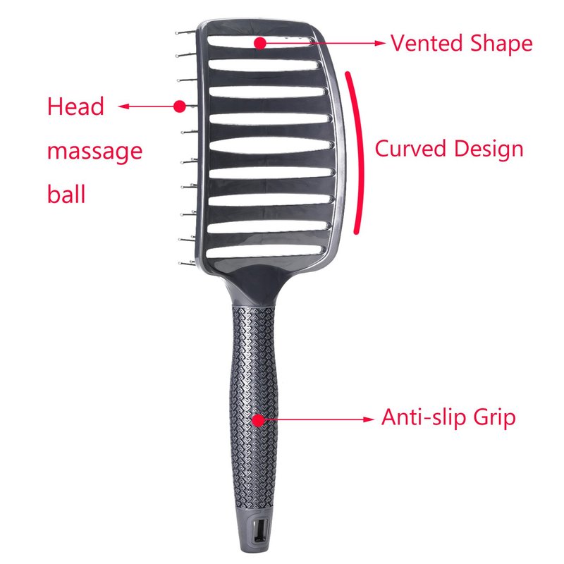 Curved Vent Brush, Barber Blow Drying Brush with Nylon Detangling Pins, Anti-Static - Grey