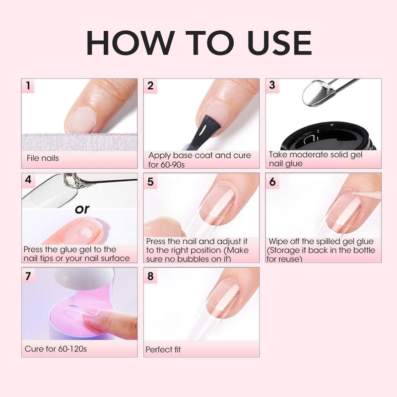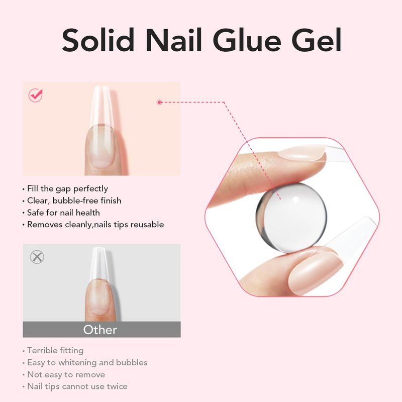 - Curvlife Solid Gel X Nails Tips :features a long-lasting solid nail glue gel that boasts a resilient, rubber-like texture. This gentle formula is non-flowing and non-sticky to hands, making it easy to work with. When cured under a nail lamp, it provides exceptional adhesion, surpassing traditional liquid glue in performance and ease of use. With proper application, this innovative gel can deliver stunning results that endure for a minimum of 2 weeks, ensuring a lasting and beautiful manicure.