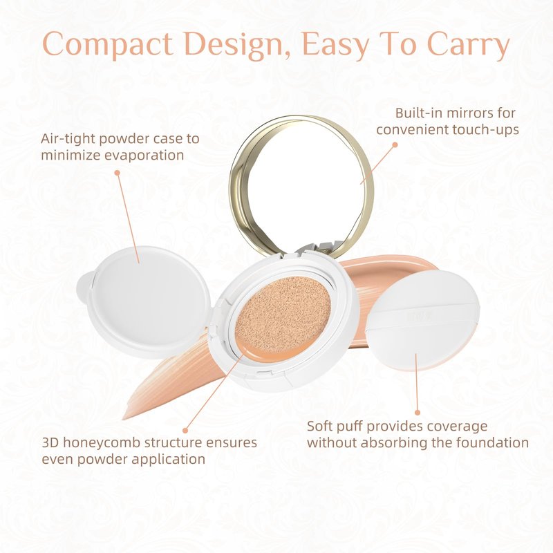 - Buildable full coverage effect: This cushion foundation has a delicate texture that is easy to apply,offering light to full coverage,lightweight, without a heavy feel,the makeup foundation won't burden the skin.Ultimately, it presents a matte and flawless finish,enhancing the overall texture of the skin.It is recommended to use it with our setting powder for enhanced makeup effects