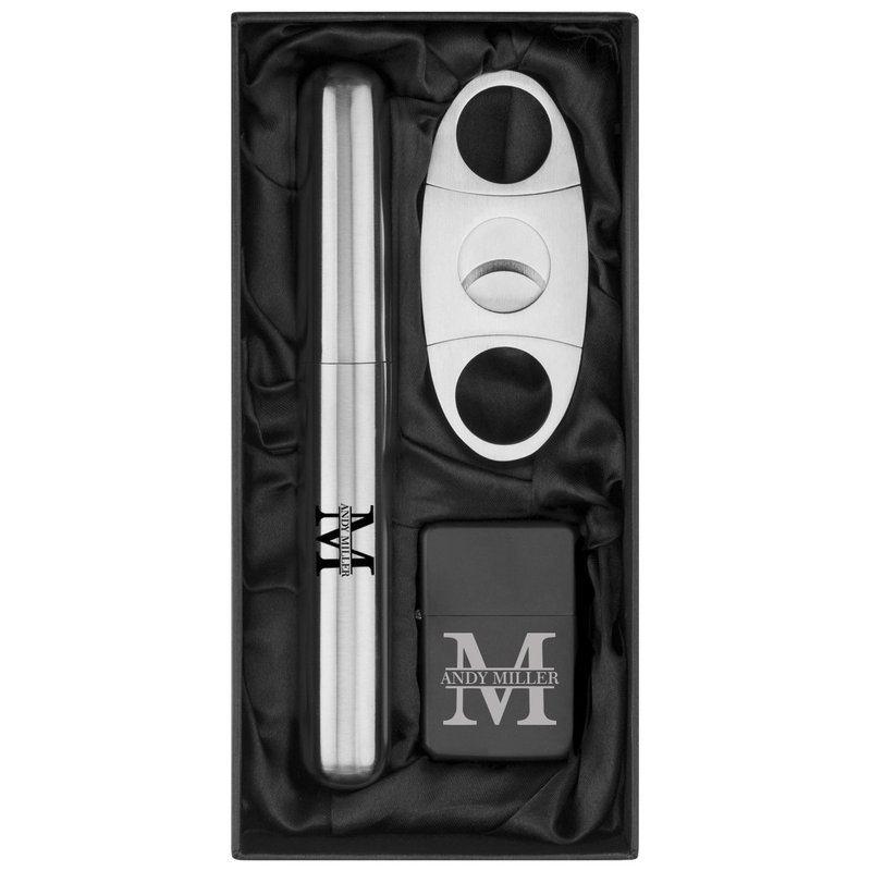 Custom Initial Engraved Stainless Steel Cigar Tube Flask, Cutter, & Lighter Gift Set Personalized