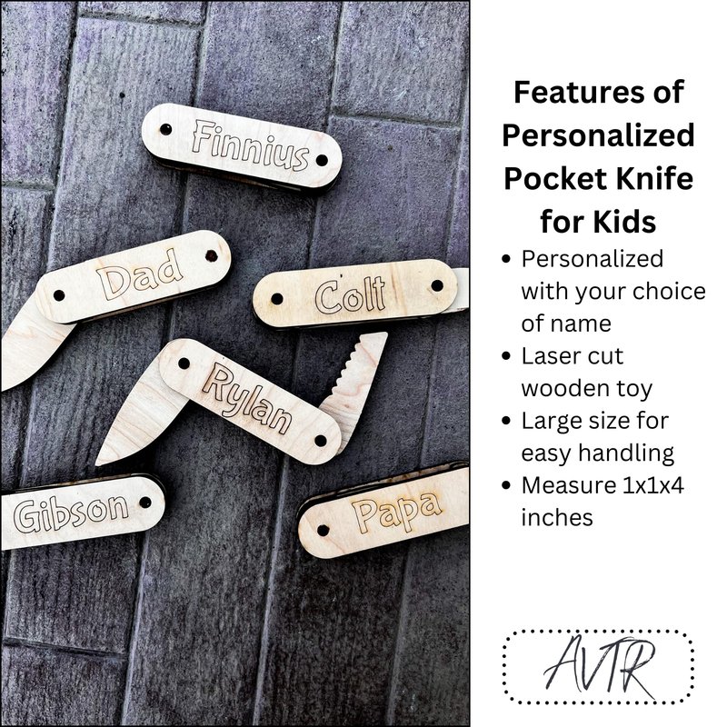 Custom Kids Pocket Knife Wooden Pretend Toy, Personalized Engraved Folding Fake Knives with Name for Safe Play, Gifts for Dad, Child, Boy, Girl, 4x1x1 AVTRBoutique