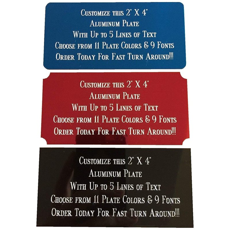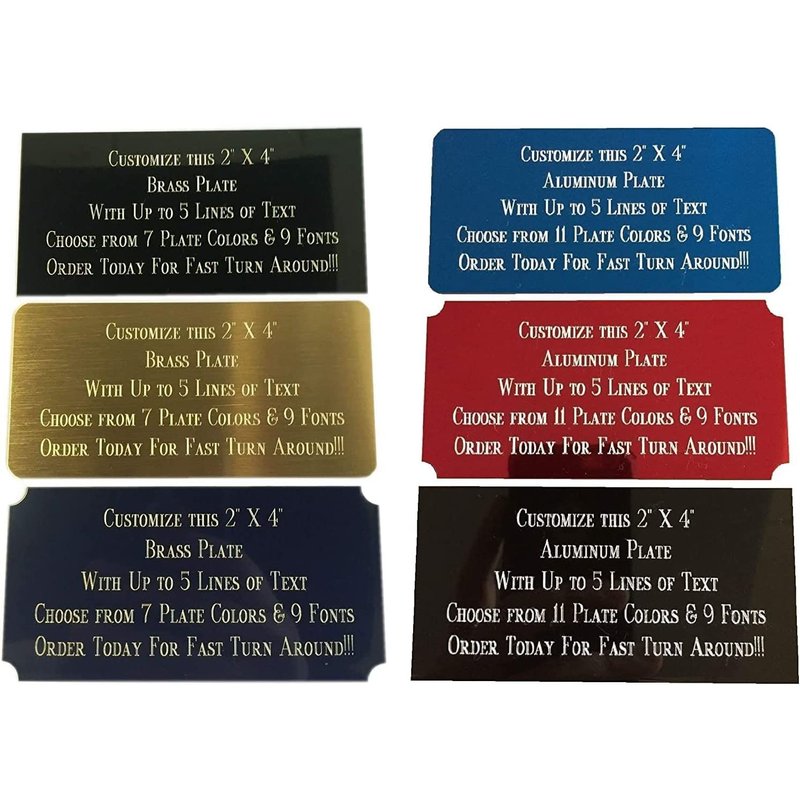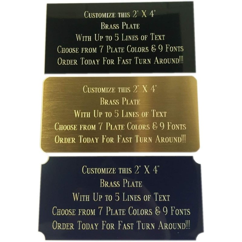 - ·PLATE SPECIFICS: You can have up to 5 lines of engraving. ALL ENGRAVING WILL BE GOLD IN COLOR FOR BRASS AND SILVER IN COLOR FOR ALUMINUM! Plate Color Choices: Gold, Black, Red, Blue, White, Red-Marbled or Black-Marbled for brass and Gold, Black, Red, Blue, Copper, Silver, Violet, Purple, Green, Red-Marbled or Black-Marbled for aluminum.