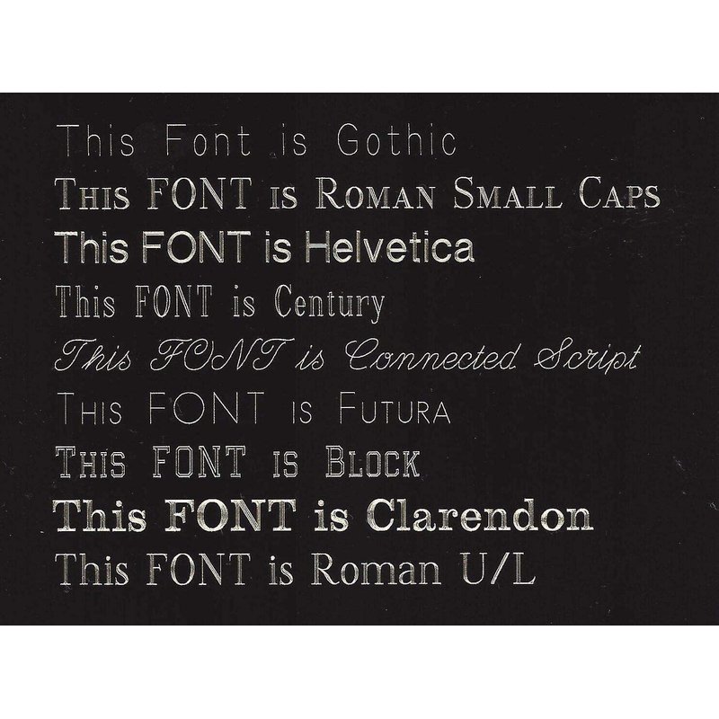 - ·Each line can have up to 50 characters including spaces. Please keep in mind, the more text per line, the more narrow the engraving will be.Please be aware that single line engraved fonts (Gothic, Futura, Contemporary, & Connected Script) are difficult to read on Gold and White plates.