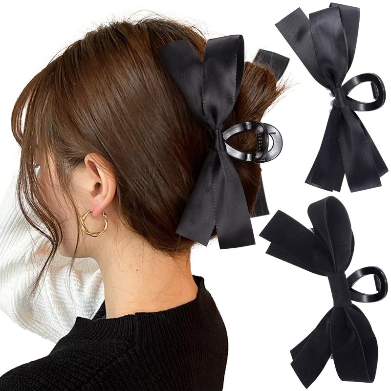 CustomyLife 2pcs Bow Hair Claw Clip for Women, Non-Slip Black Bowknot Hair Clip, Bun Updo Big Hair Barrettes Accessories for Long Short Curly Straight Thick Thin Wavy Hair
