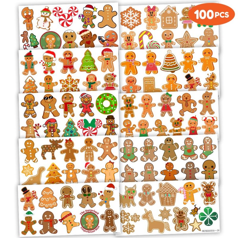 Cute Gingerbread Temporary Tattoos 10 Sheets 100 PCS Gingerbread man Party Decorations Favors Supplies Cookie Theme Birthday Stickers Gifts for Boys Girls Kids Class School Prizes Carnival Christmas