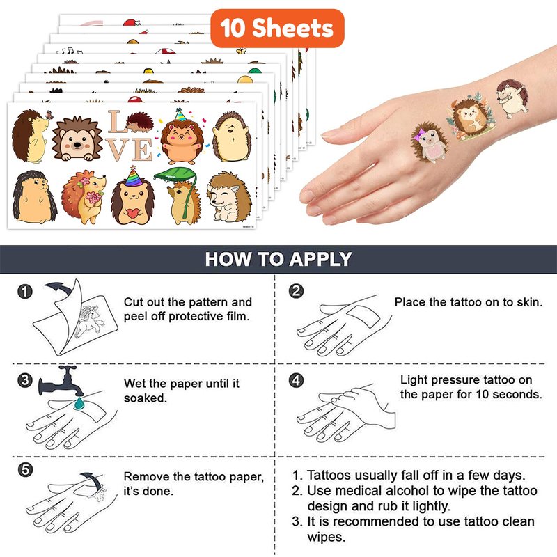 - Including ten sheets tattoos with various styles, sufficient in quantities and colors to meet your daily requirement of using and sharing. You guys can easily use this set of Hedgehog temporary tattoos and take unique photos to make fond memories.