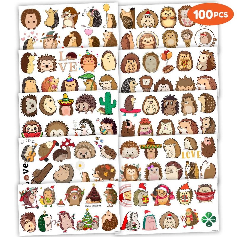 Cute Hedgehog Temporary Tattoos 10 Sheets 100 PCS Hedgehog Party Decorations Favors Supplies Theme Birthday Stickers Gifts for Boys Girls Kids Class School Prizes Carnival Christmas