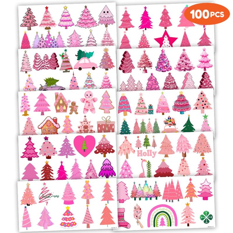 Cute Pink Christmas Temporary Tattoos Xmas Tree Birthday Party Decorations Favors Supplies Winter Themed Stickers 10 Sheets 100 PCS Gifts for Kids Girls Boys Decor Class School Carnival Christmas