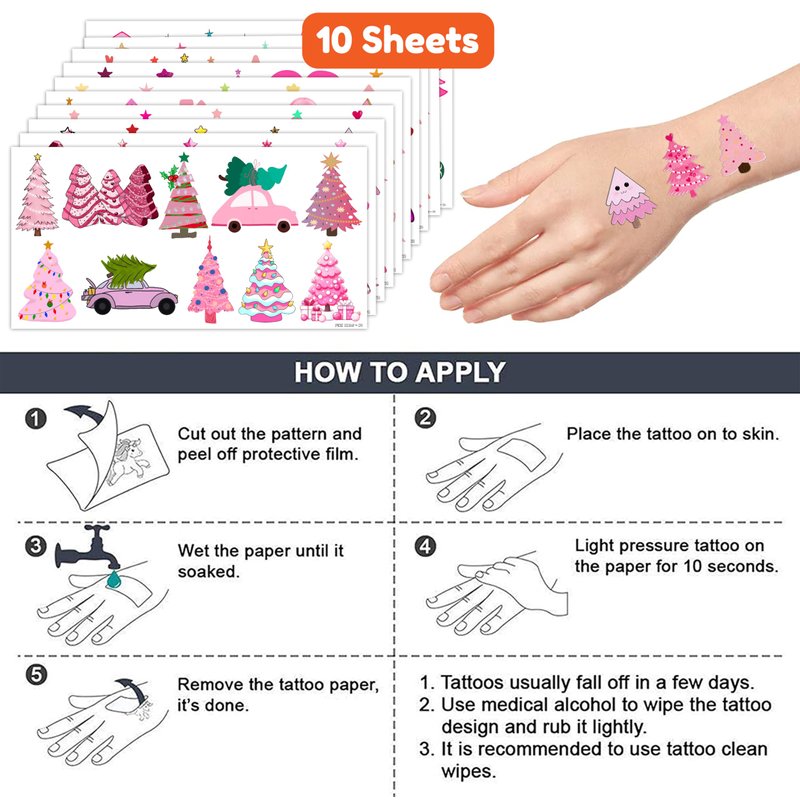 - The set of Pink Christmas Trees temporary tattoos are made of high quality safety, and totally safe for your kid's skin. Simply wet the tattoo with water and stick transferred them onto your body, hands, faces and arm you like, Tattoos will last three to five days, it also can be easily removed with baby oil, makeup remover or rubbing alcohol.