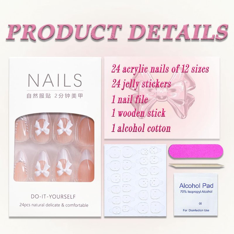 - 【Package Content】You will get 24 cute acrylic nails of 12 sizes, 1 nail file, 24 jelly stickers, and 1 wooden stick for removing false nails.