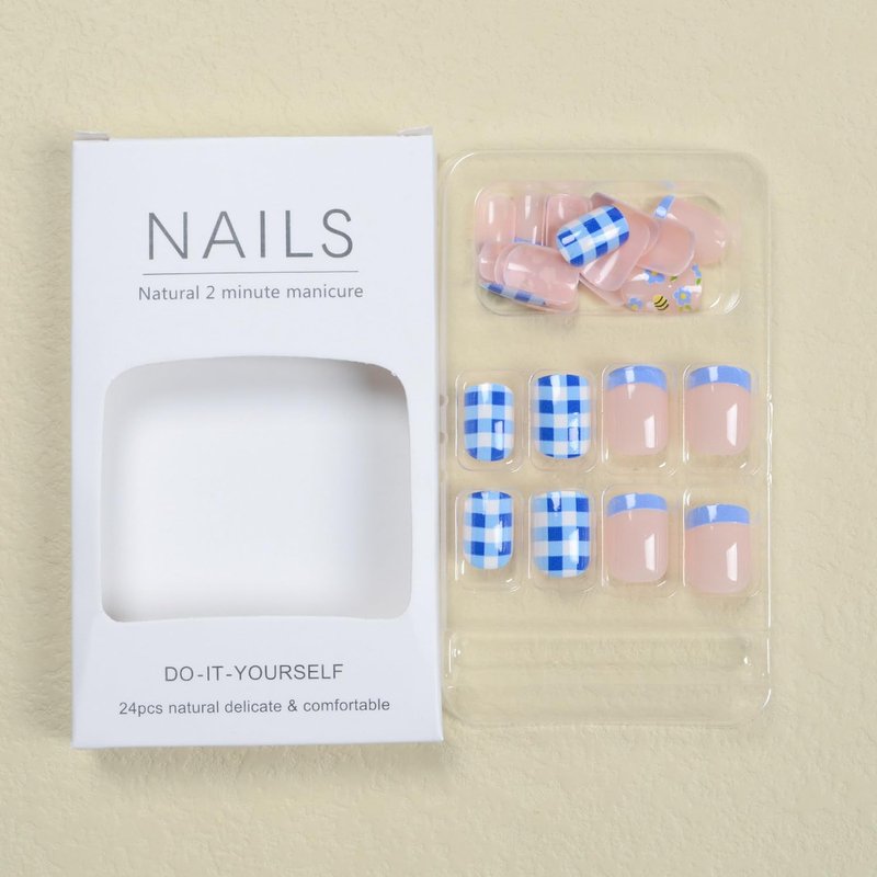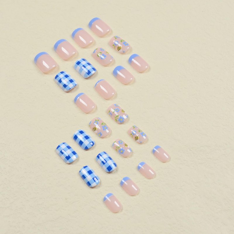 Cute Press on Nails Square Fake Nails with Bee and Flower Designs Stick on Nails Full Cover Blue and White Checkered French Tip Acrylic Nails Summer Sweet Young False Nails for Women Girls