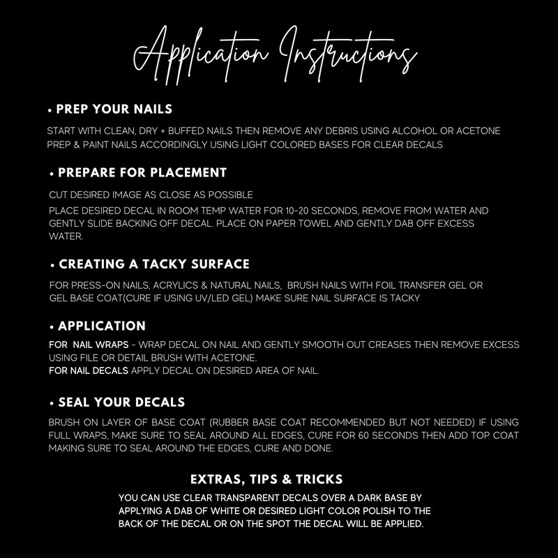 Water transfer decals are trending in the Nail Art and Beauty industry for its seamless application and versatility. Our new decals are flexible, durable and printed in HD for colorful, bold & vivid designs. These decals are a quick and easy way to add a unique touch to your manicure. They come in a variety of designs, from simple patterns to intricate images, so you can choose the one that matches your style. Whether you are a professional nail tech or beginner to the nail industry our decals are super easy to apply with full detailed instructions included.