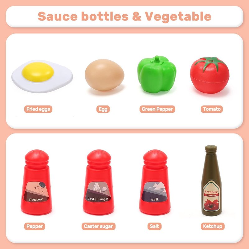 - Complete Kitchen Cooking Toy Set: 37 Pcs toy kitchen sets include induction cooker, play pots and pans, kettle, toy kitchen cookware, knives set, pretend food & vegetables, we also added some seasoning like pepper, caster sugar, salt, and ketchup to add more fun for cooking pretend play