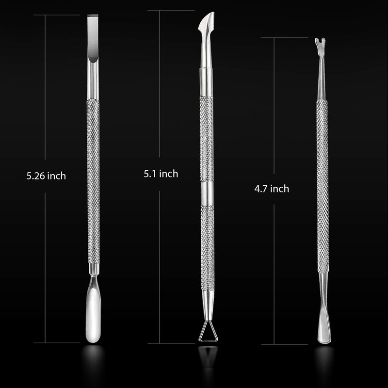 - Superb Craftsmanship: Textured rounded handles of our cuticle remover tool & cuticle pusher set ensure maximum nonslip control while working on cuticles and nails. These tools are polished without any sharp edge. Your nails won’t be scratched while using our manicure tools. These are made of high grade stainless steel, hence, rust proof and retain precision for a very long period of time.