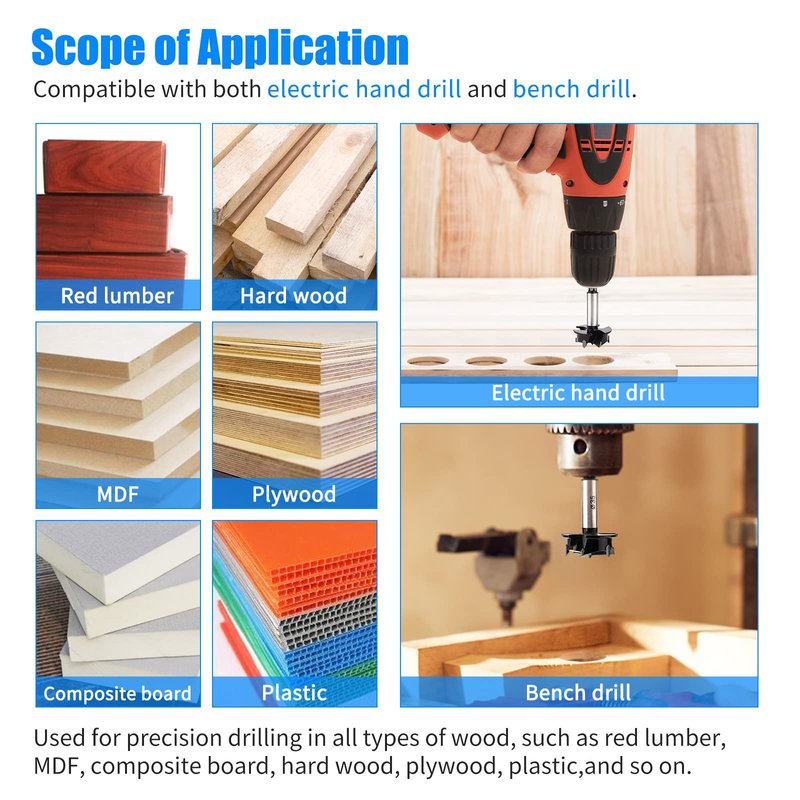- [Widely Applications] The sharp drill bit can be used for drilling holes on on wood and plastic products, furniture, door hinge, desk. Used on cutting wood, plywood, solid wood boards, MDF, plastics, etc. Great for boring concealed hinges and door locks.