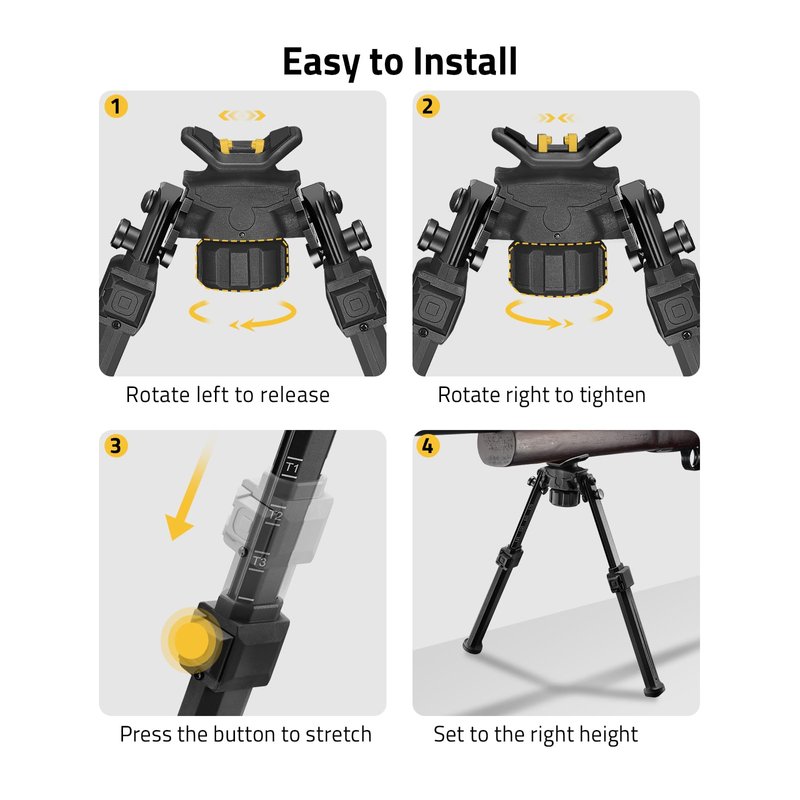 - Six-level Height Adjustment: The bipod's compact size and folding capability also make it convenient for transportation and storage. The adjustable legs of the rifle bipod offer great versatility, from 7.5 to 10.6 inches. The pivot bipod locks into place with a satisfying click, ensuring a tight fit.