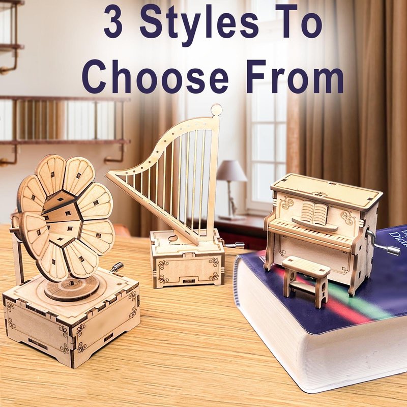 CYAZOO 3in1 3D Wooden Puzzle for Adults Music Box Set-Kids DIY Musical Instrument Model Assembly Puzzles Hands Craft Building Kits Home Decoration (3PCS: Gramophone+Piano+Harp)