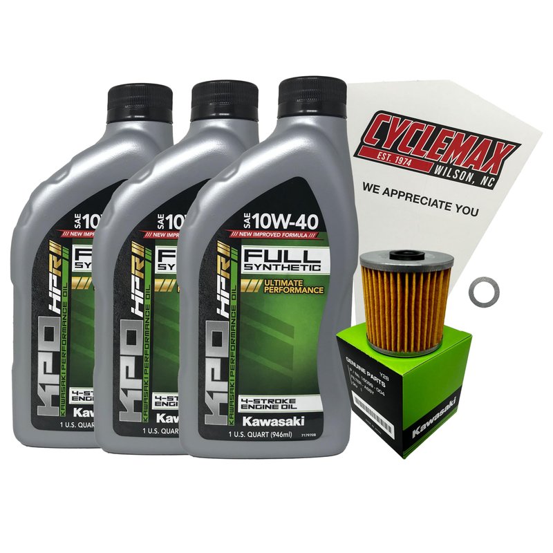 - CYCLEMAX OIL CHANGE KIT INCLUDES: Three Kawasaki K61021-500-01Q KPO Full-Synthetic MC 10W40 Quarts of Oil, One Kawasaki 16099-004 Oil Filter, One 12mm Drain Plug Crush Washer and a Convenient Disposable Funnel.