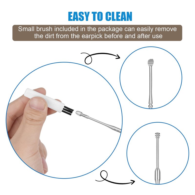 - 【EASY TO CLEAN】: The earwax removal kit is of all steel construction, can be rinsed thoroughly with soap and water. Then disinfect these ear picks with rubbing alcohol.