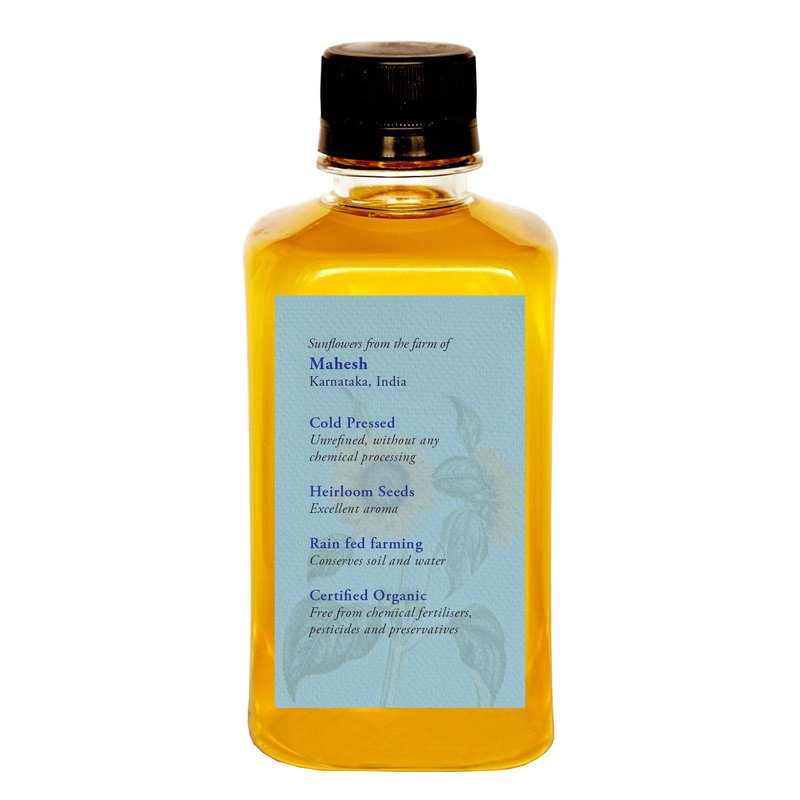 Daana's Sunflowers are organically grown in family farms along the Kaveri river in Southern India. They use hardy native varieties that have been passed down through generations in their family. The oil is extracted using the cold pressed method (kachchi ghani) to preserve nutrients.
