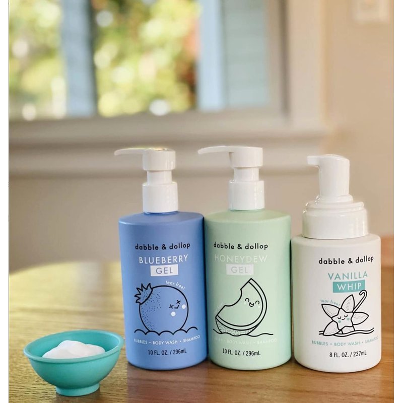 - IT'S THE BERRY BEST. Dabble & Dollop’s 3-in-1 Blueberry Bath Gel captures the sweet, crisp, tart magic of that little round berry from the North. Every dabble of Blueberry Gel is delightfully rich, luxurious, and provides a soft creamy lather for your children. The velvety gel can be used for a bubble bath, body wash or shampoo.