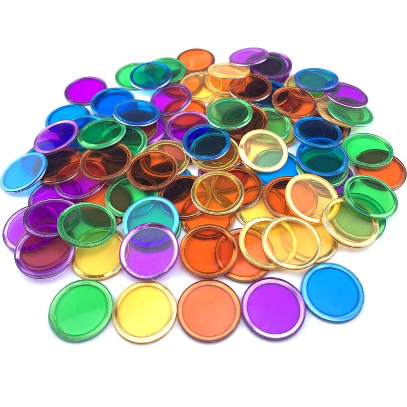 - COMPACT BINGO GAME SET--100 pieces((red/orange/blue/green/purple) plastic markers , each measures 0.65 inch/1.7cm in diameter.
