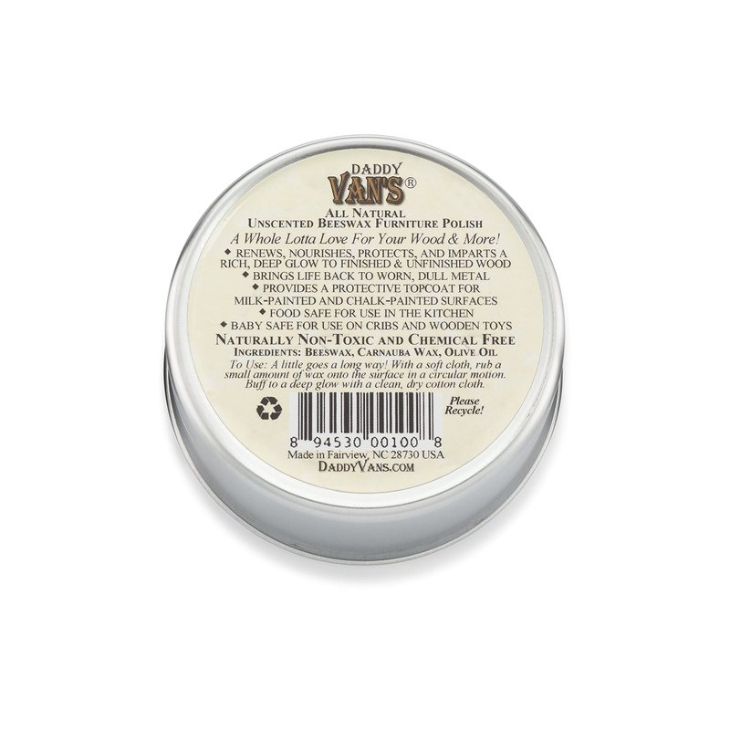 Daddy Van's All Natural Unscented Beeswax Furniture Polish nourishes and renews all finished and unfinished wood surfaces. Daddy Van's is a third-party tested, USDA Certified 100% Biobased blend of wood-conditioning, food safe ingredients, and every ingredient is listed on our label. That means that you can rest assured that this beeswax furniture polish is truly free from harmful chemicals, and that it is safe for your home and your family. Daddy Van’s wood wax is an odorless blend of beeswax, carnauba wax and olive oil is food safe for use in the kitchen and baby safe for use on cribs and wooden toys. And the best part is that Daddy Van's leaves furniture and cabinetry nourished, healthy, and glowing. Who can use Daddy Van's Beeswax Furniture Polish? Everyone who wants to give the wood in their home the best care possible. Daddy Van's All Natural Unscented Beeswax Furniture Polish is your go-to wood conditioning wax, and it will renew, nourish and bring out the natural beauty of all the wood in your home: furniture, antiques, kitchen cabinets, bathroom cabinets, built-ins, wood accents and accessories, butcher block counter tops, wood paneling, wood trim, and wooden toys... the applications are endless!