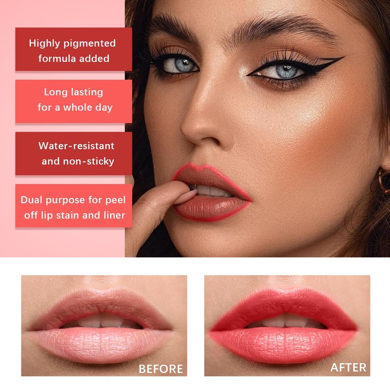 - LONG LASTING AND WATERPROOF: With the addition of a special formula, this lip stain peel off is long-lasting and waterproof. You can apply lip color for a long time without fading. Lip liner stain is characterized by its soft and light texture, giving you a non-greasy feeling. And don’t concerned about fade when eating and drinking.