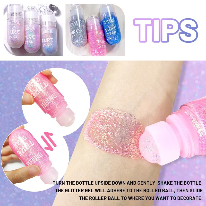 - 【Convenient Design】Unlike regular face glitter, the roll-on glitter does not require extra tools or your fingers to apply the gel out. Simply invert the bottle of face glitter and gently shake it a few times for the gel to attach to the ball before applying it to the skin.The shiny gel will spread evenly across your skin easily.