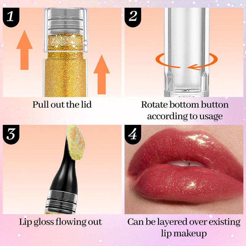 - EASY TO USE: Pull out the lid of the glitter lip gloss, you can see the sponge applicator head, gently rotate the bottom, making the lip gloss flow out, and then evenly spread on the lips, creating a charming lip color makeup look.
