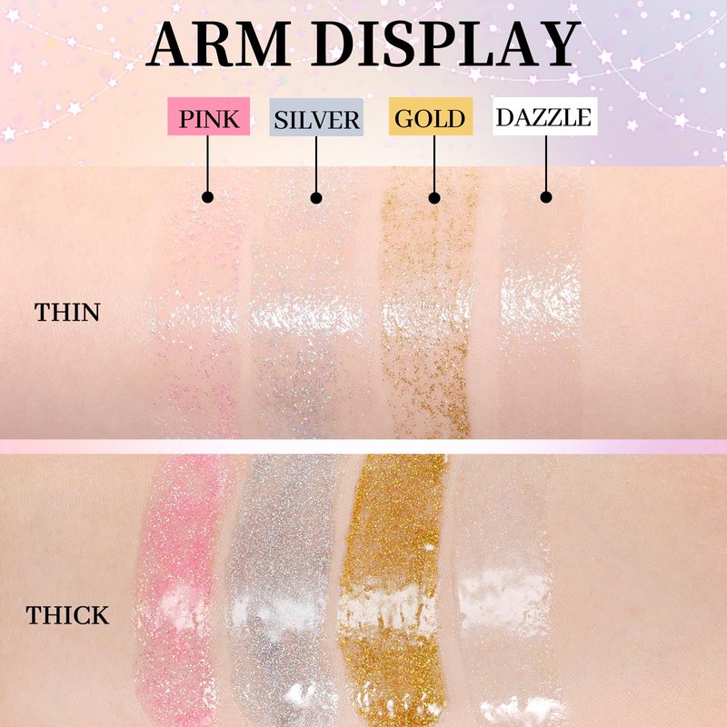 - DAZZLING LIP COLORS: This lip gloss with fine shimmer will create a dazzling visual effect on your lips. Available in four sparkle colors to meet your different needs - light pink, silver, gold and white. You can choose the appropriate lip color to match your makeup or clothes according to individual needs, making you become the focus of the crowd.